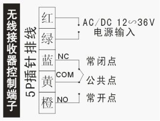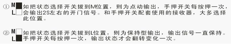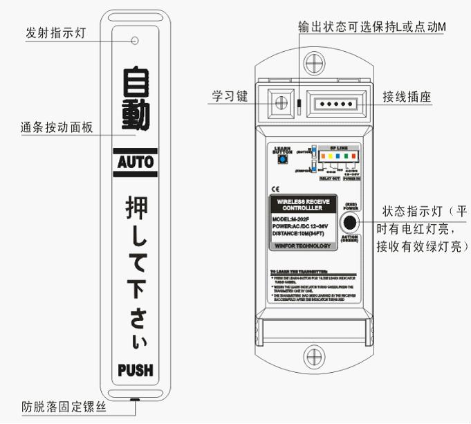 1、本產(chǎn)品為自學(xué)習(xí)碼型,使用前須把遙控器編碼學(xué)到本控制器中方可使用。 (出廠時已把隨機遙控器學(xué)好)同一編碼只須學(xué)習(xí)一次。最多能學(xué)習(xí)16種不 同編碼。 2、學(xué)習(xí)方法:按下學(xué)習(xí)鍵,指示燈變?yōu)榫G色,進入學(xué)習(xí)狀態(tài),此時按下要 學(xué)習(xí)的遙控器任意鍵,綠燈閃爍兩下,即可學(xué)習(xí)成功。3秒后自動退出回到待 機狀態(tài)。 3、刪除方法:按下學(xué)習(xí)鍵5秒,綠燈閃爍幾下,即可刪除全部編碼。(本產(chǎn)品 不設(shè)單個刪除) 4、保持或點動輸出切換時要在斷電狀態(tài)下切換,否則切換無效。 5、打開外蓋,內(nèi)置拔碼開關(guān),可錯開編碼使用,防止相鄰兩臺設(shè)備相干擾。 三、產(chǎn)品整體特征: 1.采用聲表諧振器穩(wěn)頻技術(shù),頻率一致性好,無線收發(fā)穩(wěn)定度高。 2.收發(fā)撥碼對配,用戶操作簡潔方便。 3.Pu光油外殼固化及厚膜貼標(biāo),外殼美觀耐磨;防脫落螺絲固定設(shè)計。 4.工作頻率315M,穩(wěn)定度優(yōu)于10-5。收發(fā)均采用內(nèi)置銅質(zhì)天線,無線傳送距離遠,抗干擾能力強。 5.手押器采用低功耗發(fā)射技術(shù),發(fā)射距離遠,耗電省,電池使用壽命長。 6.三點按動觸發(fā)設(shè)計,保證手押器通條按動有效,觸發(fā)輕巧可靠手感好。 7.具有大小容量兩組接點信號輸出,可供外部自動門機及電鎖門禁所需。 8.無線接收后,觸發(fā)動作時間1∽9秒可調(diào),方便各種門控要求。 四、輸入輸出引線定義 五、無線接收器應(yīng)用接線示例 無線接收器控制自動門機接線圖 六、輸出狀態(tài)選擇 七、主要技術(shù)參數(shù) 供電電源:AC/DC12∽36V 靜態(tài)電流:15mA 動作電流:80mA(無線接收器) 主接點容量:20A 14VDC 副接點容量: 1A 24VDC (無線接收器) 接點吸合保持時間:2秒 (無線接收器) 供電電源:6V (兩顆3V鈕扣電池) 發(fā)射電流:3.9mA(手押器) 電池使用壽命:每天平均按押500次,則優(yōu)質(zhì)電池可耐時300天(手押器) 收發(fā)距離:視實際現(xiàn)場電氣屏蔽環(huán)境,正常條件下可達5米以上。 工作環(huán)境溫度:-42℃∽45℃ 工作環(huán)境濕度:10∽90%RH 外觀尺寸:203mm(L)×41mm(W)×18mm(H)(手押器) 123mm(L)×50mm(W)×32mm(H)(無線接收器) 重量:195克(手押器,不含電池) 150克(無線接收器) |